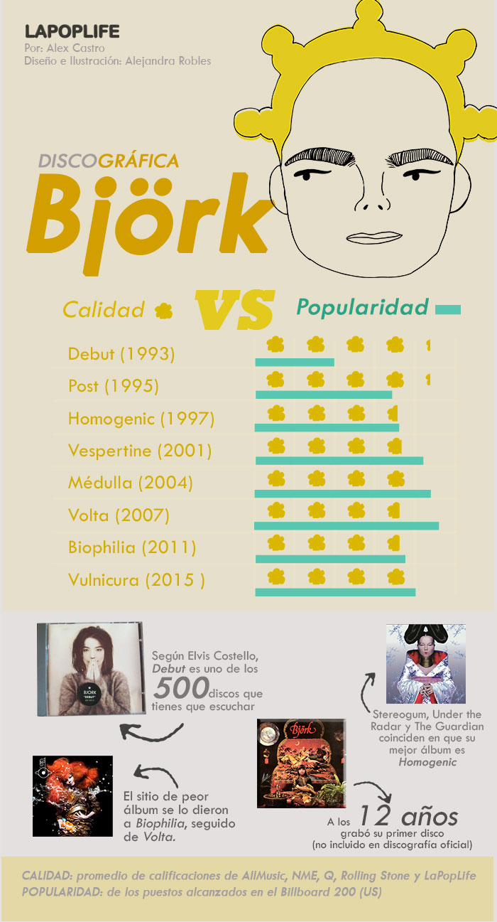 ¿Cuál es el mejor disco de la cantante islandesa y cuál el peor? ¿Su mejor álbum es también el más conocido? Para responder estas y otras dudas, preparamos esta infografía en la que confrontamos la calidad vs. la popularidad de cada una de sus grabaciones oficiales.