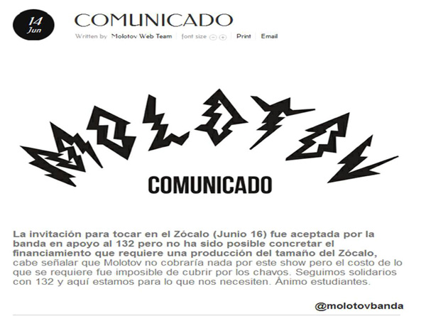 El colectivo se acercó también a Molotov, quienes aparentemente se mostraron dispuestos a participar. Con el documental Gimme The Power en la cartelera cinematográfica, el nuevo movimiento estudiantil y las elecciones presidenciales en puerta, era el momento ideal para un evento de esa magnitud. Todo indica que las negociaciones iban bien, porque a mediados de la semana pasada incluso hubo algunos medios que publicaron la noticia, aunque Molotov se apresuró a informar que no había nada confirmado.